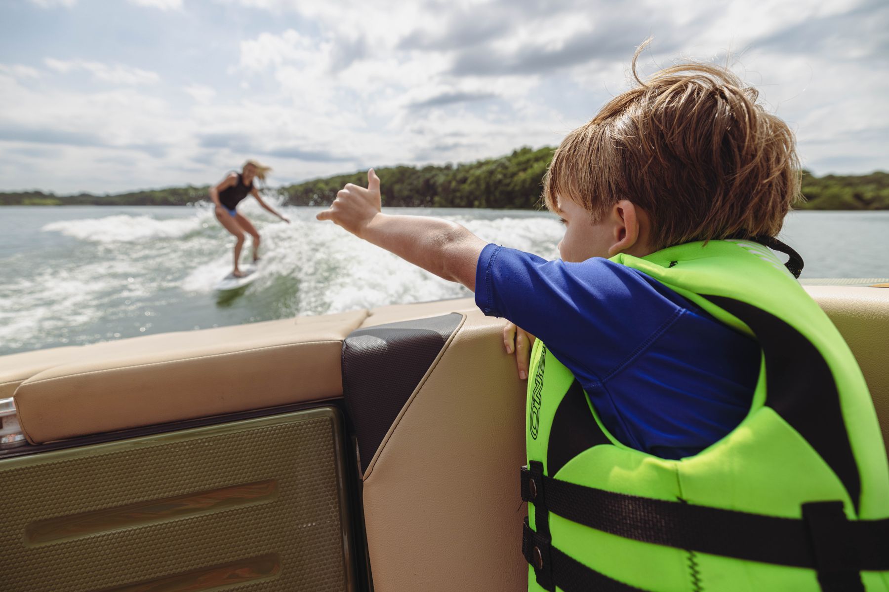 Royalty-free image - A smiling young child wearing an orange life jacket is outdoors near water. Text on the image reads “2024 Recreational Boating Statistics,” published by the U.S. Coast Guard in July 2025.