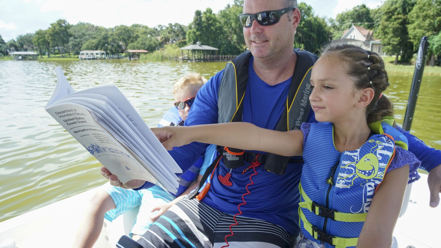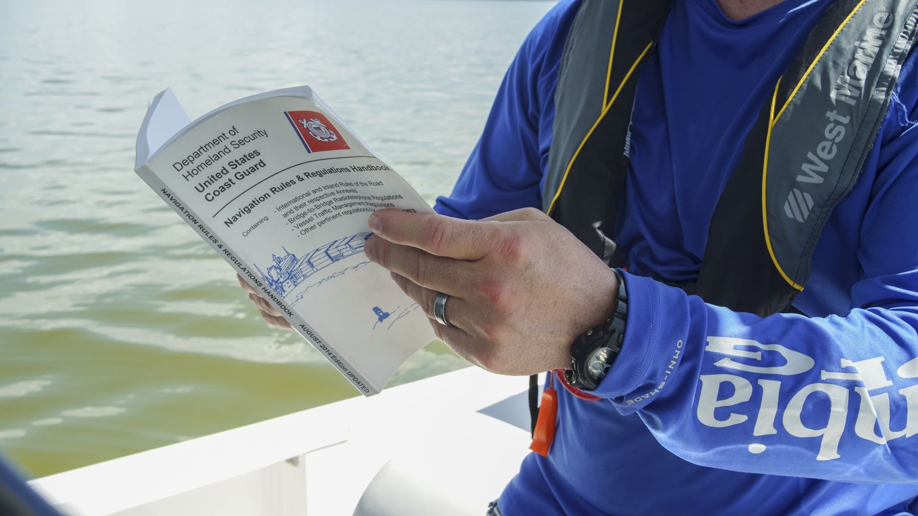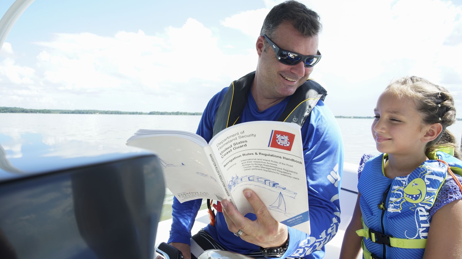 Royalty free images of boaters wearing proper safety equipment while reading the USCG Navigation Rules Book