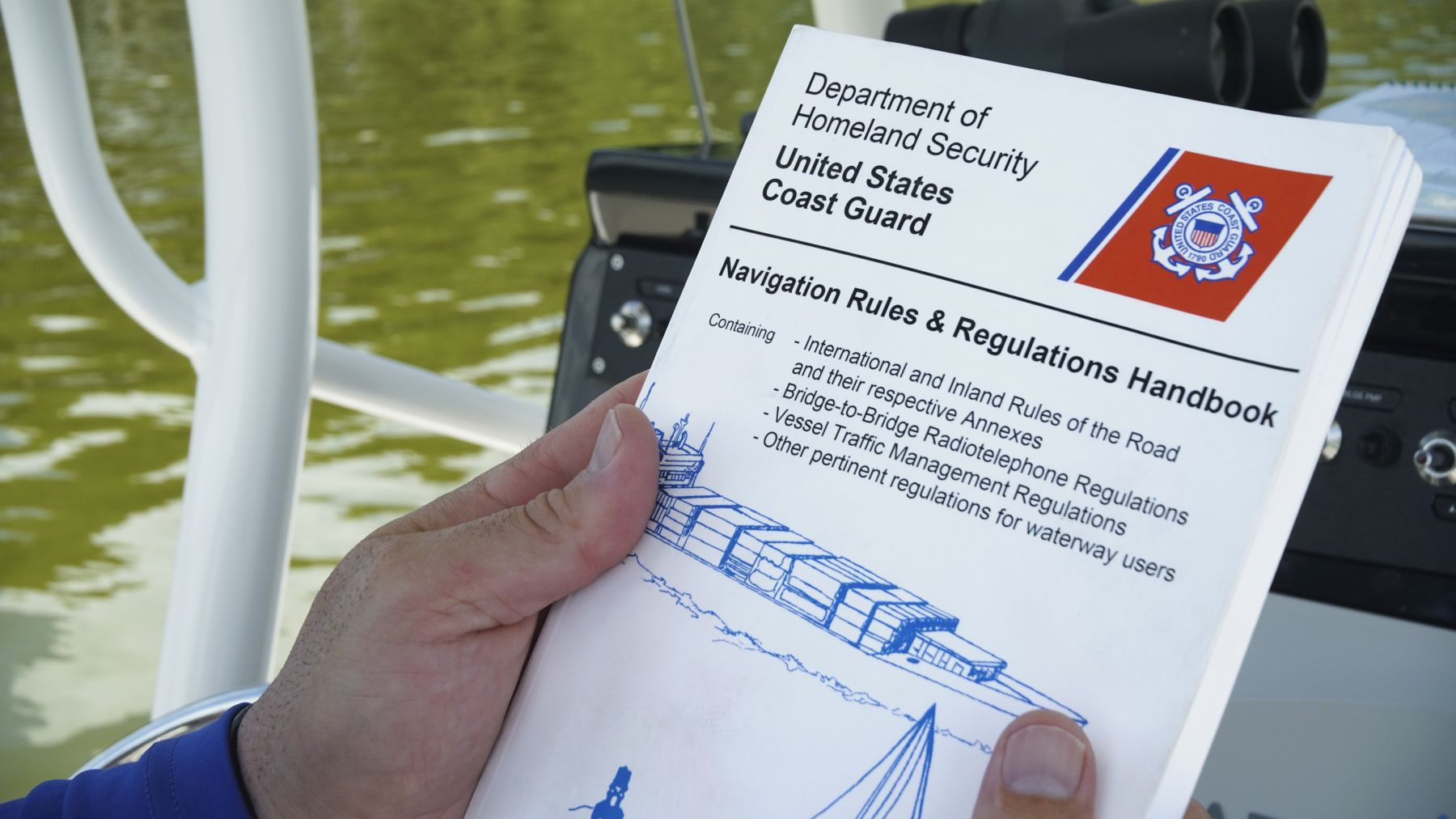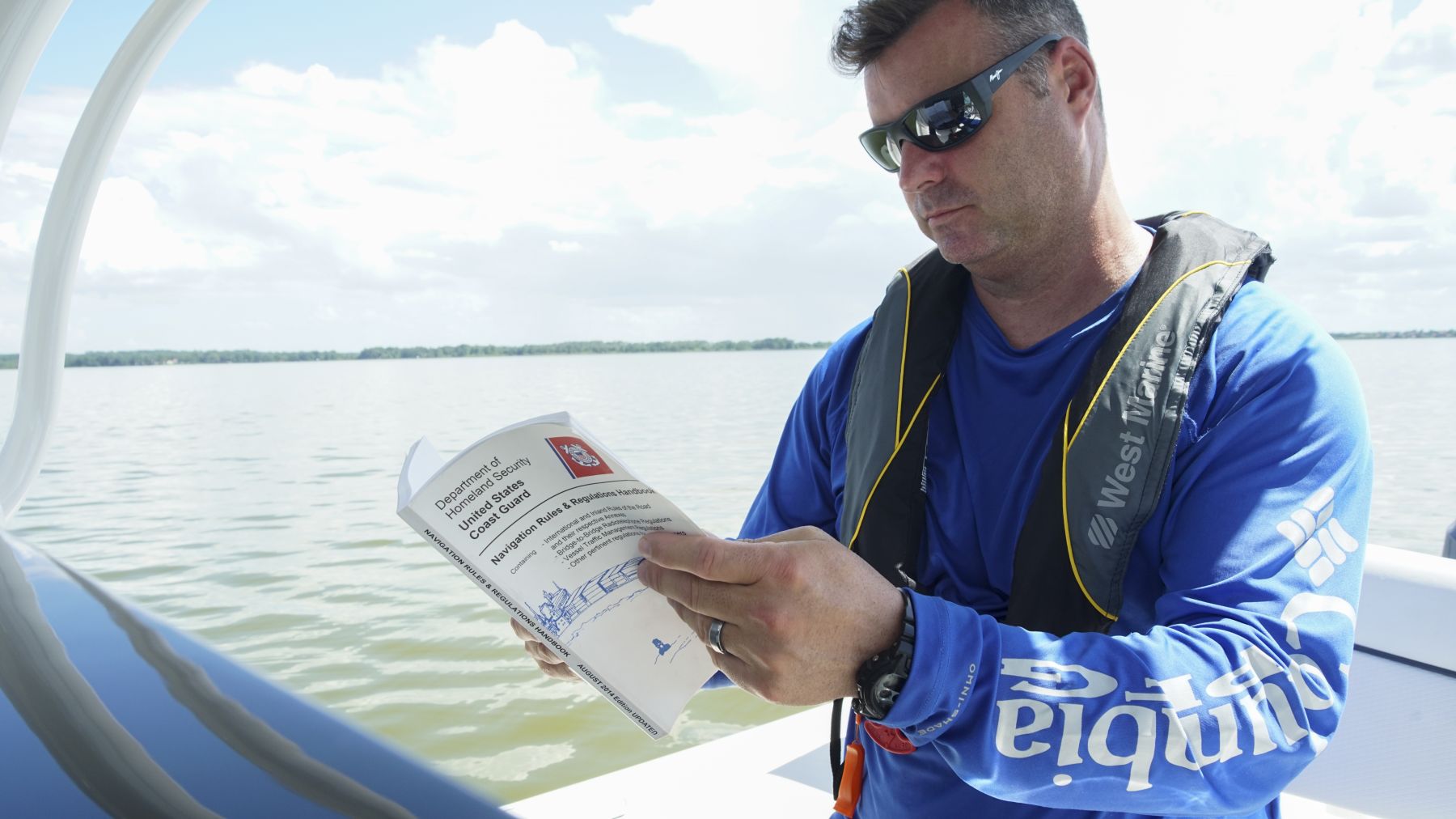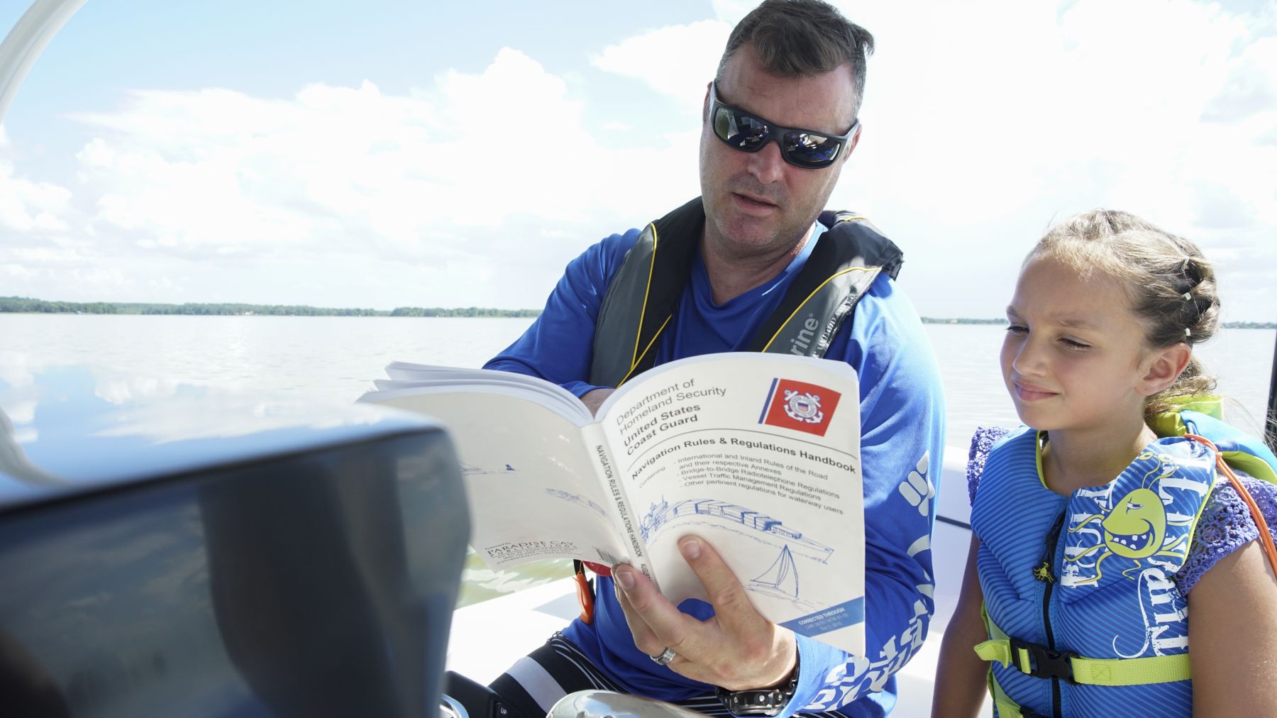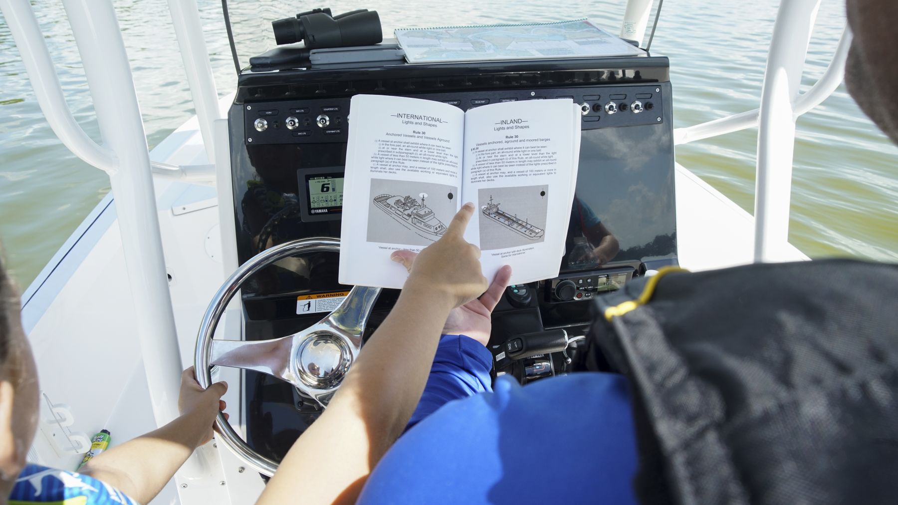 Royalty free images of boaters wearing proper safety equipment while reading the USCG Navigation Rules Book